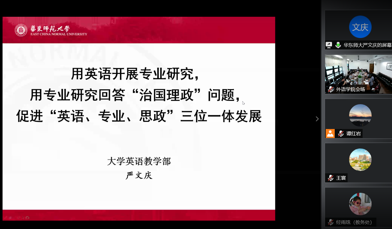 华东师范大学外语学院大学英语部主任严文庆作了题为“用英语开展专业研究,用研究回答治国理政问题,促进英语、专业、思政三位一体发展——学习《习近平谈治国理政》第三卷”的报告。他以《学术英语》课程为例,围绕大学英语课程体系建设和学生综合能力培养,详细介绍了课程教学设计,指出教师要用学术研究项目回答治国理政问题,实现大学英语、学科专业、课程思政“三位一体、协同发展”。