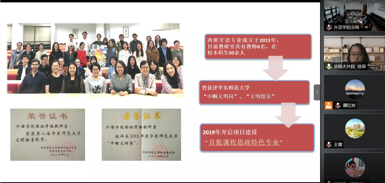 华东师范大学外语学院西班牙语专业负责人徐泉作了题为“西班牙语课程思政特色专业建设心得——以学习《习近平谈治国理政》第三卷为例”的报告。她介绍道,西班牙语专业积极推进课程思政教育教学改革工作,在《拉丁美洲历史和文化概论》《西班牙语笔译》《西班牙语口译》《西班牙语精读》等课程中的教学设计和实践中融入思政元素。此外,西语专业还将课程思政的理念拓展到社团实践活动,形成课堂内外协同育人的合力。