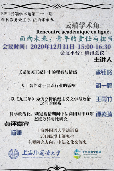 SISU云端学术角第二十一期由教务处主办,由法语系承办,将于12月31日15:00准时开启!本期活动以「面向未来:青年的责任与担当」为主题,邀请到四位法语系优秀本科生在文学、翻译、区域与国别研究等领域进行学术分享与交流,并邀请博士研究生进行点评。SISU云端学术角,期待您的积极参与!