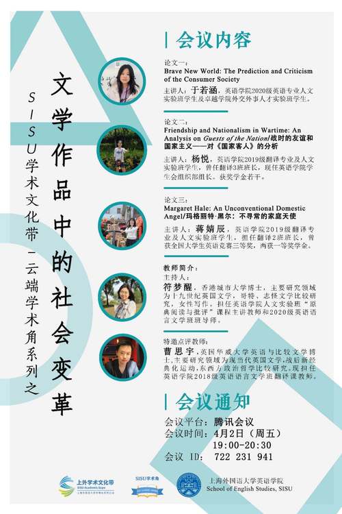 SISU云端学术角第二十三期活动由教务处主办,英语学院人文实验班承办,将于4月2日19:00准时开启!本期活动采用国际学术会议Panel Discussion的形式,以“文学作品中的社会变革”为主题进行云端研讨,展示英华学子的文学思考与理解,分享学术感悟与心得。SISU云端学术角,期待您的积极参与!