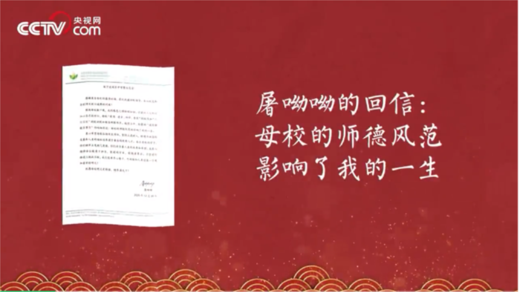 新闻传播学院白宇同学通过主办方选拔,代表学校参与了有关节目的录制。白宇的文物故事“屠呦呦的回信:母校的师德风范影响了我的一生”,起源于宁波教育博物馆珍藏的一封信件,讲述的是屠呦呦与母校宁波效实中学的故事,展现了母校师长对其的殷殷关切和谆谆教诲,体现了学校的校风校训对其成长道路的深远影响,表达了屠呦呦对母校的殷切感恩之情和期待不断培养优秀人才的美好期许,是中国“立德树人”使命不断赓续传承的真实记录。