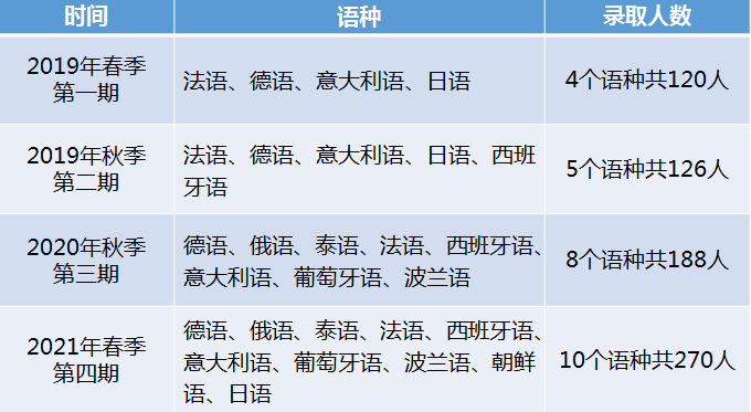 开设班级:日语、俄语、泰语、法语、西班牙语、意大利语、葡萄牙语、波兰语8个学习班级
