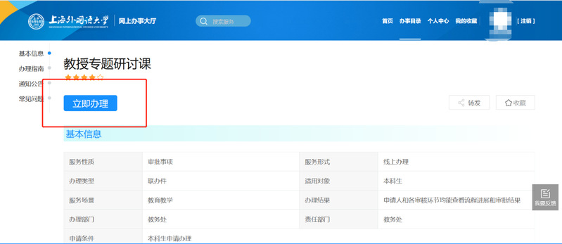 进入上海外国语大学网上办事大厅(网址:ehall.shisu.edu.cn),选择业务部门为教务处分类下“教授专题研讨课”模块,通过统一身份认证登录后,点击“立即办理”。