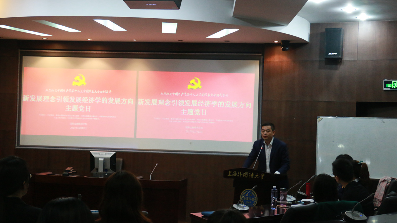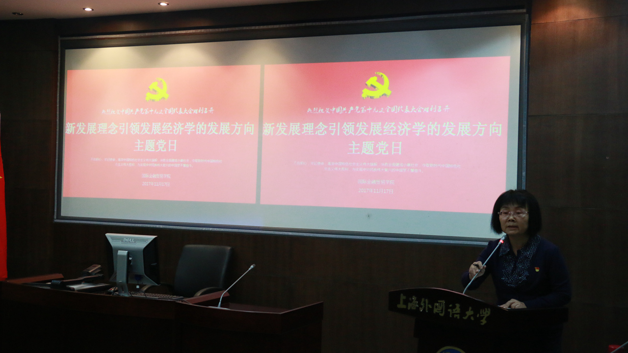 2017年11月17日下午,上海外国语大学国际金融贸易学院在虹口校区MBA报告厅开展“新发展理念引领发展经济学的发展方向——学习十九大精神”主题党日活动,国际金融贸易学院全体教职工和2017级金融硕士学生党支部全体成员共同参与了此次活动。本次主题党日由党总支书记戴迪萍主持,组织部部长张静、副部长孔令涛、外办主任张红玲、特邀督导员沈志强、俄欧亚学院党总支书记皮凡倩、教工支部书记苏祖梅,莅临现场观摩。