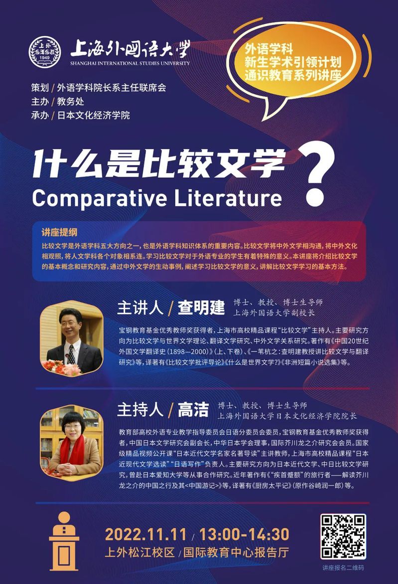 比较文学是外语学科五大方向之一,也是外语学科知识体系的重要内容。比较文学将中外文学相沟通,将中外文化相观照,将人文学科各个对象相系连。学习比较文学对于外语专业的学生有着特殊的意义。本讲座将介绍比较文学的基本概念和研究内容,通过中外文学的生动事例,阐述学习比较文学的意义,讲解比较文学学习的基本方法。