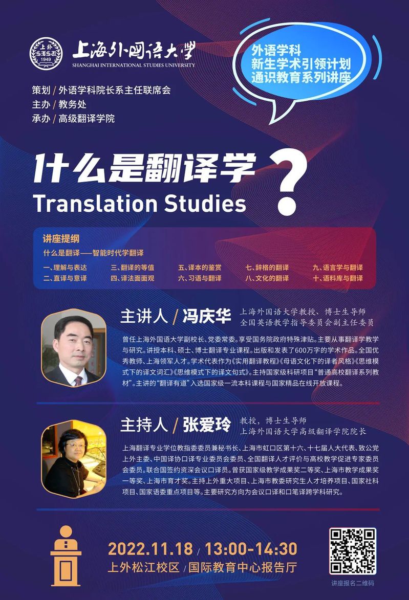 冯庆华,上海外国语大学教授,博士生导师,全国英语教学指导委员会副主任委员。曾任上海外国语大学副校长、党委常委。享受国务院政府特殊津贴。主要从事翻译学教学与研究。讲授本科、硕士、博士翻译专业课程。出版和发表了600万字的学术作品。全国优秀教师、上海领军人才。学术代表作为《实用翻译教程》《母语文化下的译者风格》《思维模式下的译文词汇》《思维模式下的译文句式》。主持国家级科研项目“普通高校翻译系列教材”。主讲的“翻译有道”入选国家级一流本科课程与国家精品在线开放课程。