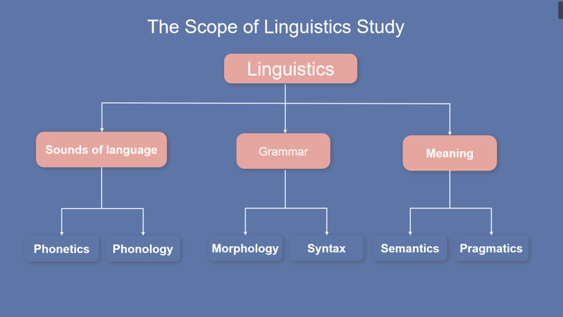 郑老师用结构图向同学们清晰地呈现了语言学研究的范围。语言学主要包括三个方面的研究:语音(sounds of language)、语法(grammar)和意义(meaning)。其中,语音包括语音学(phonetics)、音韵学(phonology)两个分支;语法包括形态学(morphology)、句法学(syntax)两个分支;意义包括语义学(semantics)、语用学(pragmatics)两个分支。随后,郑老师用实例对语言学的六个分支详细展开了讲解。