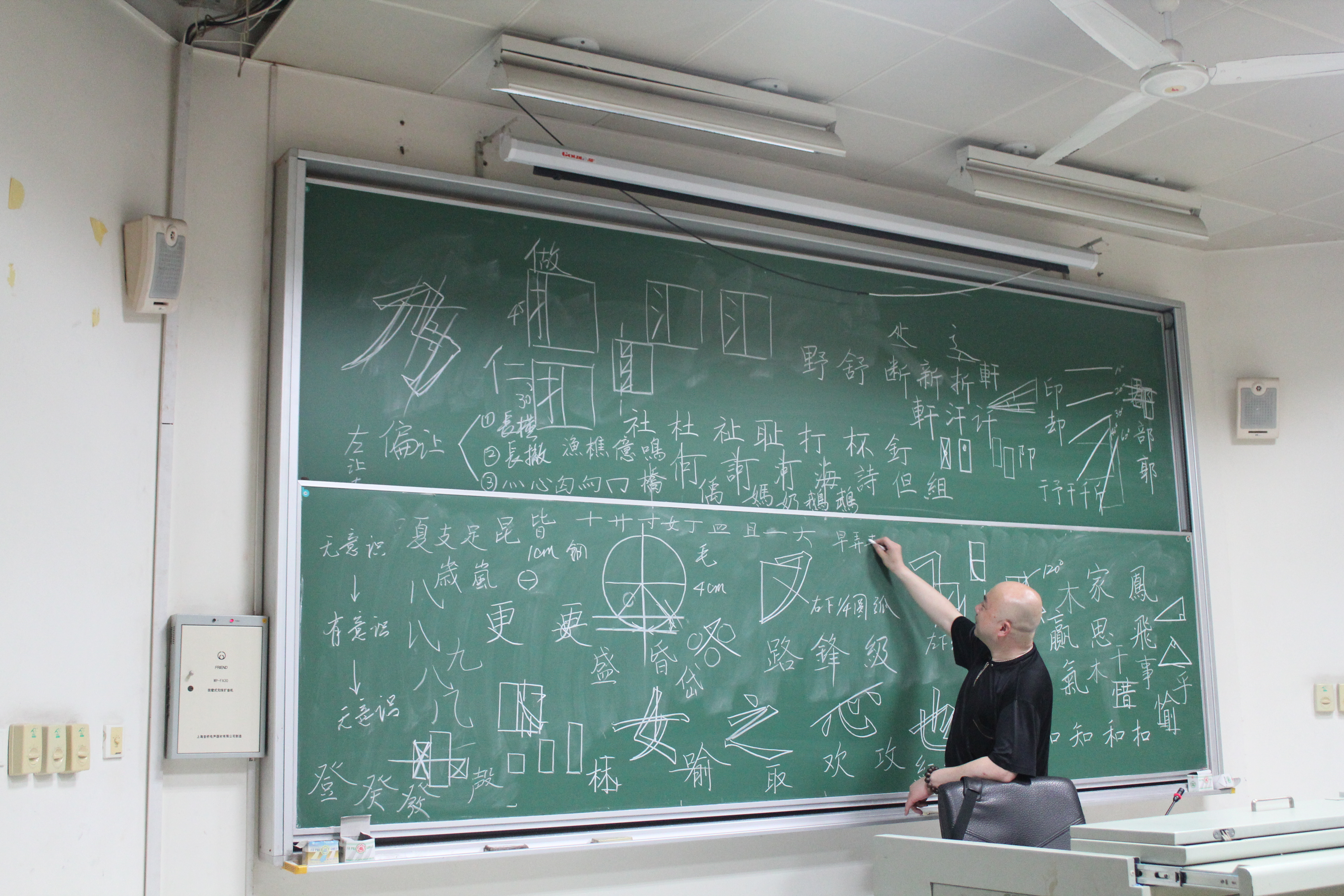 另外陆老师还详细讲解了汉字的构造,以及不同的结构在楷书书写时注意事项其中着重讲解了左右结构和上下结构。全方位阐述汉字楷书的书写规律,用正方、短长方、长方的概念来演示汉字楷书的书写。例如他说到正方结构的如果在汉字的左边,应该放在左上方,如果在汉字的右边,应该放在右下方,短长方结构的应该居中书写,用具体的角度概念来诠释汉字楷书书写过程中各种笔画的位置,通过天覆地载、偏让出头、伸手收脚、伸脚收手等形象化的概念让上外学子理解汉字楷书书写的精髓。
