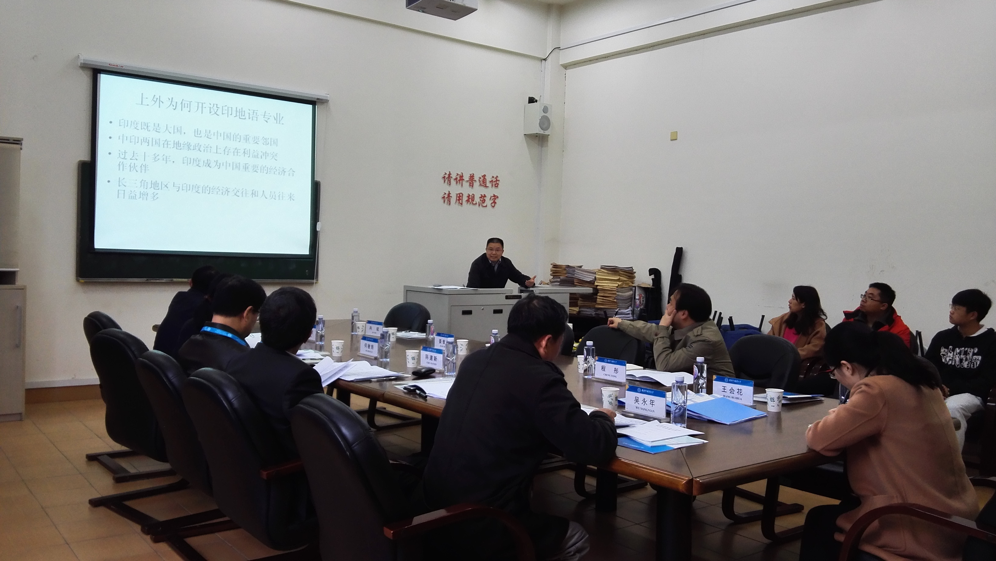 4月11日,以复旦大学陈建新教授为组长的专家组一行5人,对我校印地语专业进行学士学位授予审核评估。专家组听取印地语专业负责人冉斌自评汇报,并通过现场考察、听课、查阅支撑材料、与教师和学生代表座谈等方式,对我校印地语专业办学情况进行全面考察。专家组在肯定我校印地语专业建设水平的基础上,提出了相关改进意见。副校长杨力、教务处处长姜智彬、东方语学院院长程彤出席审核评估会议。我校印地语专业于2011年获批开设,2013年正式招生,现有在籍本科生11人。(教务处、东方语学院)