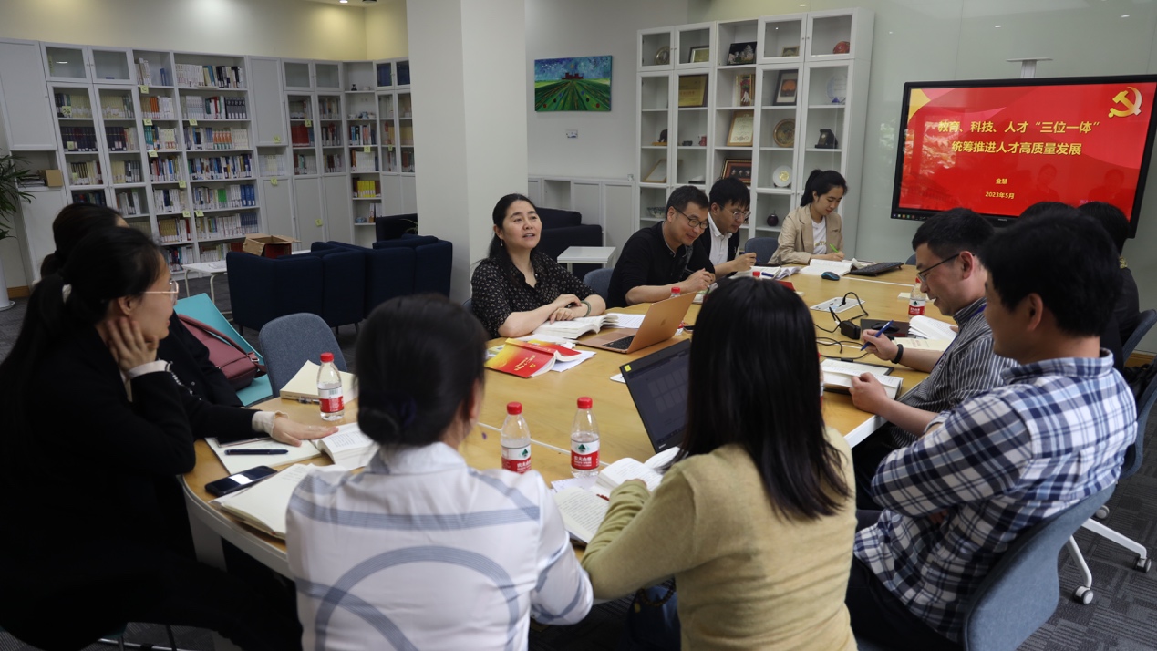 金慧结合阅读《习近平著作选读》第一二卷、《习近平新时代中国特色社会主义思想专题摘编》等文献,带领大家学习了习近平总书记关于教育、科技、人才“三位一体”统筹推进高质量发展等重要论述的原文,交流了自己的学习体会。