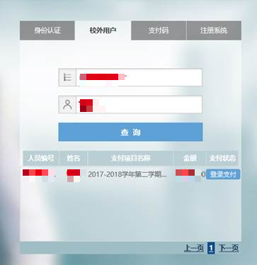 (一)打开浏览器,在地址栏输入http://epay.shisu.edu.cn/进入“上海外国语大学收费服务管理系统”。点击校外用户标签页,人员编号栏输入上外本科生学号,姓名栏输入本人姓名,然后点击查询按钮,查询到需要缴费的项目,点击登录支付按钮(如图例示):