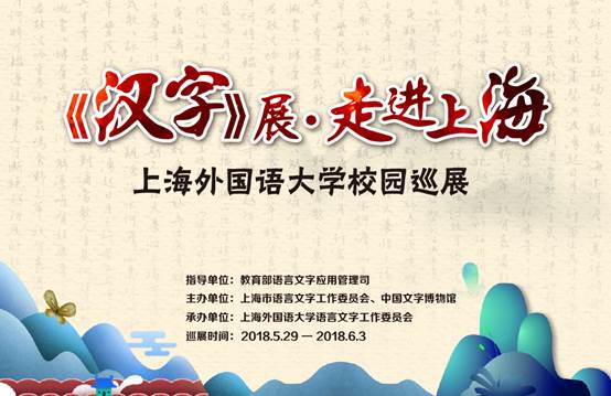 5月29日—6月3日,由上海市语委办联合中国文字博物馆举办的《汉字》展上海巡展将在上海外国语大学开展。此次巡展包括《汉字》展、《结晶——中国当代书画名家精品展》、《中华国宝 • 青铜器仿制品展》、《中华书韵》舞蹈、书法家现场书写演示等。对此,上海外国语大学将在5月25日—6月5日期间集中开展“汉字情·中国梦”系列语言文字推广工作。