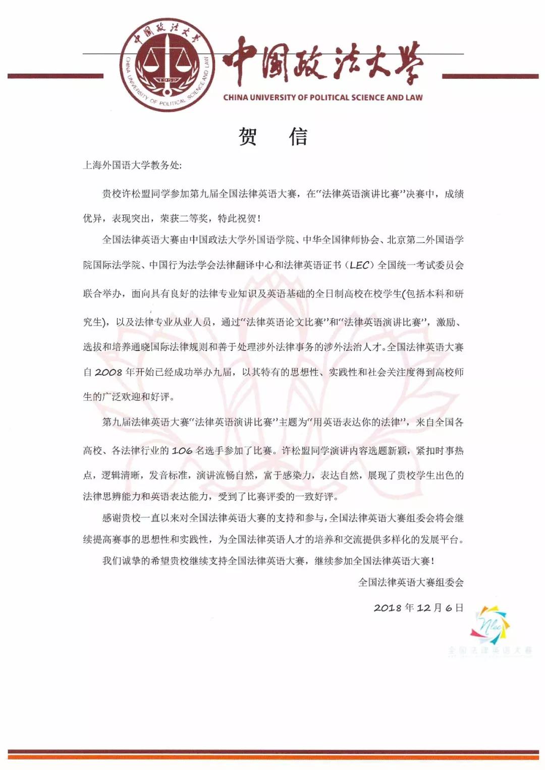 2018年11月24-25日,由中国政法大学外国语学院、中华全国律师协会外事委员会、北京第二外国语学院国际法学院、中国行为法学会法律翻译中心和法律英语证书(LEC)全国统一考试委员会联合举办的第九届全国法律英语大赛在中国政法大学成功举行。本次比赛吸引了全国各大高校参加。上海外国语大学2017级涉外卓越法律人才实验班学生许松盟在来自全国各高校一百多名选手中脱颖而出挺进决赛,并荣获大赛二等奖。