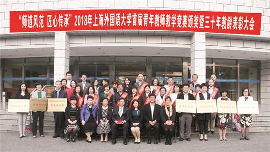 10月24日,“师道风范 匠心传承”上海外国语大学首届青年教师教学竞赛颁奖暨三十年教龄表彰大会在虹口校区举行。大会由党委教师工作部、工会、教务处、人事处和教师发展中心主办。上海外国语大学校长李岩松、党委副书记王静、钱玲等出席大会。校工会常务副主席于朝晖主持会议。