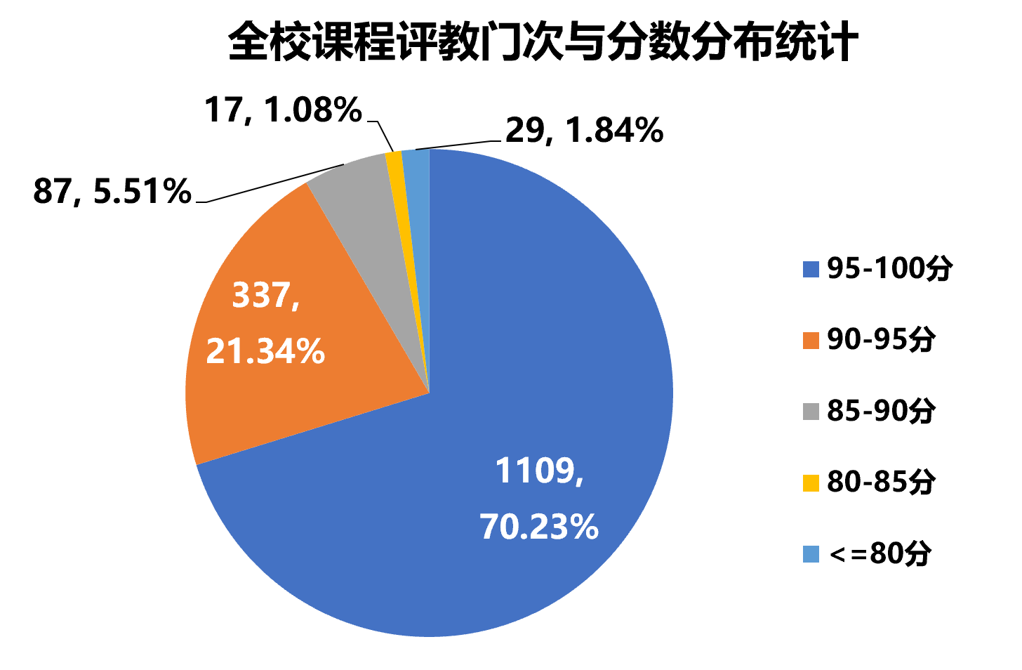 课程评教得分95-100分的1109门次,占比70.23%;90-95分的337门次,占比21.34%;85-90分的87门次,占比5.51%;80-85分的17门次,占比1.08%;80分及以下的29门次,占比1.84%。详见下图。