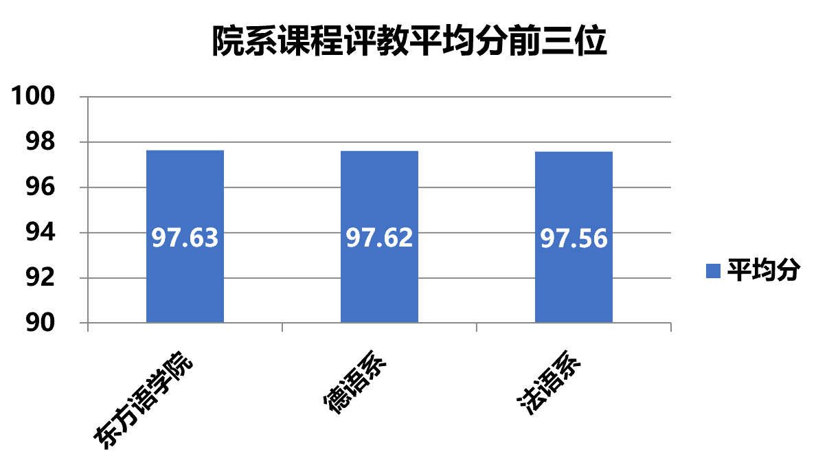 全校课程评教平均分为95.89分,平均分最高的前三位分别为东方语学院(97.63分)、德语系(97.62分)和法语系(97.56分)。