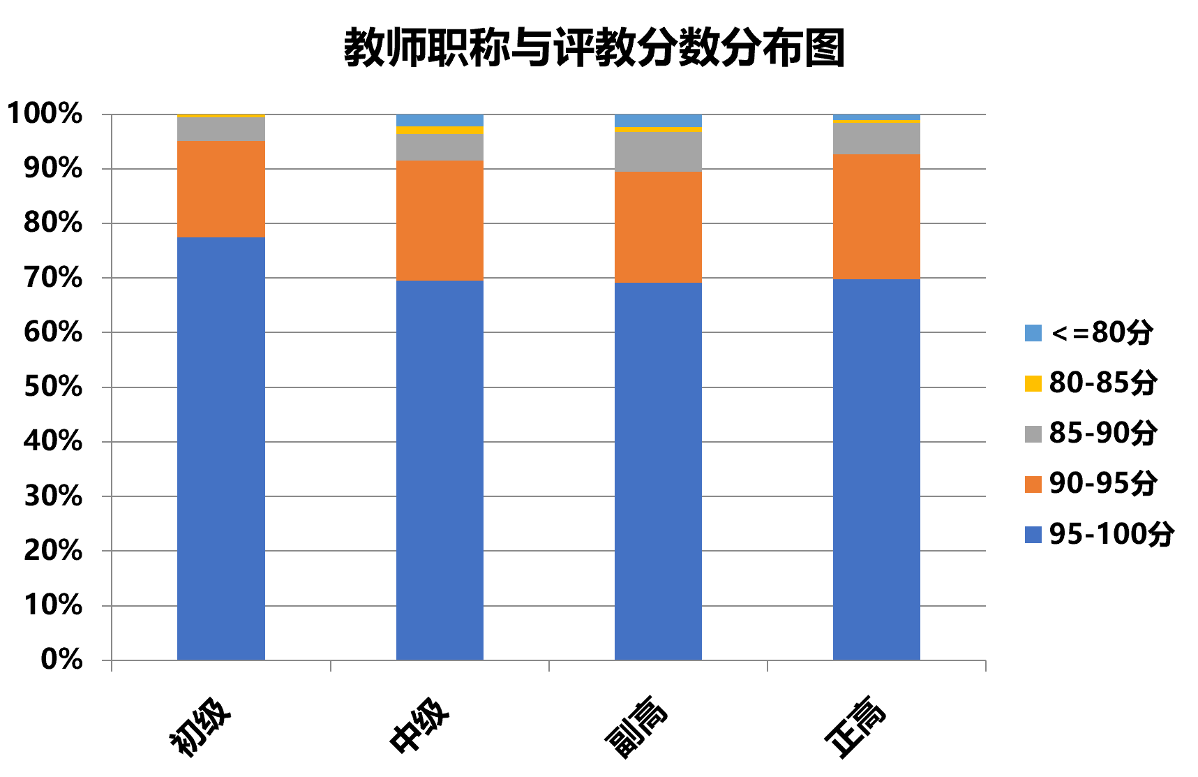 根据不同职称教师评教平均分统计,初级职称为96.64分,中级职称为95.76分,副高级职称为95.60分,正高级职称为95.90分。不同职称教师评教得分分布见下图。