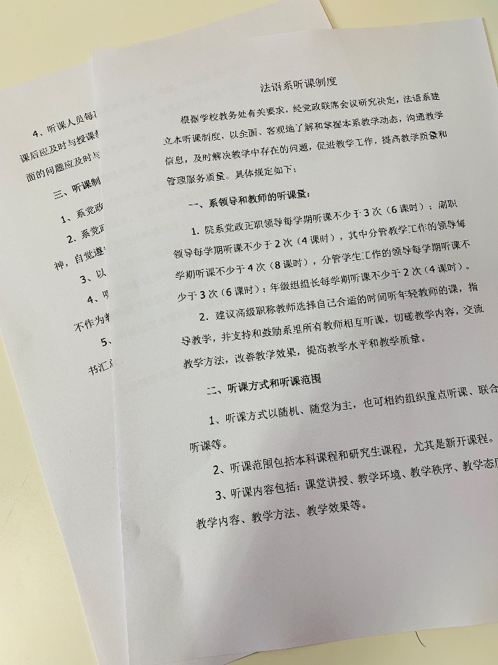 教授听课制度:对青年教师进行“传”“帮”“带”。系党政领导和高职称的教师应以办学的主人翁精神,自觉遵守和坚持听课制度,有助于全面、客观地了解和掌握本系教学动态,帮助青年教师及时发现教学中的不足,推动教学水平和质量提升。