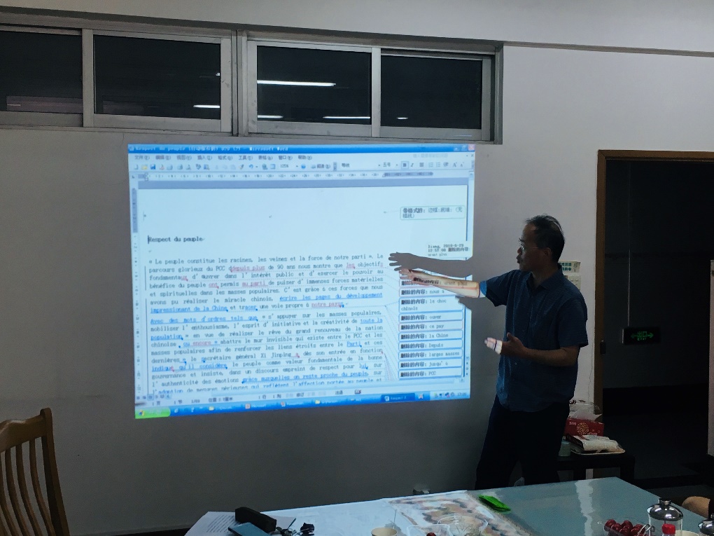 2018年9月28日下午,法语系博导钱培鑫教授和陈伟教授以翻译《习近平用典》外译项目的过程体会为主旨,将思政教育与教学科研工作有机结合,在全系展开《习近平用典》翻译学习分享会,对其现实意义和背景义理进行解读、阐释,引导青年教师树立“课程思政”理念,深入推进法语系课程思政教育教学改革。