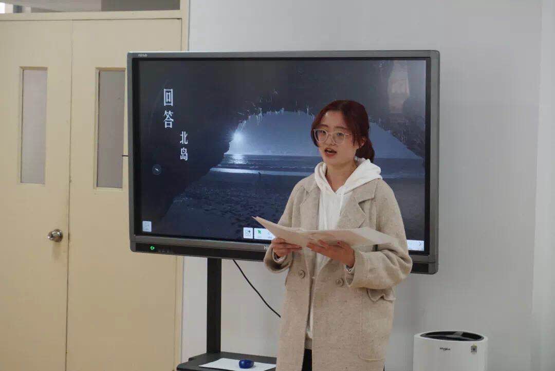 随着音乐的缓缓响起,叶颖小组低吟浅颂:“当蜘蛛网无情地查封了我的炉台,当灰烬的余烟叹息着贫困的悲哀… ”两位选手分工朗读,随着音乐的激昂,随着诗情的澎湃,他们渐渐铿锵:“朋友,坚定地相信未来吧...相信未来、热爱生命”。整首诗流畅自然,情感由沉积至薄发。虽是温柔悦耳的女子之声却也充满了希望与力量。”