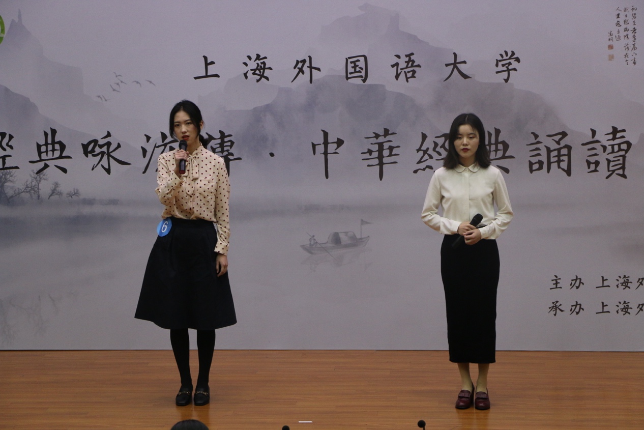 3月28日晚六点,上海外国语大学“经典咏流传”中华经典诵读大赛决赛于图文西厅顺利进行,国际教育学院院长金慧老师、教务处副处长王会花老师、上海视觉艺术学院语委办公室主任,播音主持专业系主任田奇蕊老师、校艺术教育中心常务副主任李然老师、汉语国际教育专业系主任郑瑜老师共同担任本场比赛的评委。来自各个学院的一共16组选手们都精心准备,为我们带来了精彩绝伦的视听盛宴。一字一句,尽是情怀;一颦一蹙,满是深情。无论是唯美清新的深情诉说,还是慷概激昂的壮烈陈词,诗词之美与内心情感的完美融合都在选手们的作品中得到了很好的体现。下面让我们来感受一下此次决赛的精彩瞬间吧!