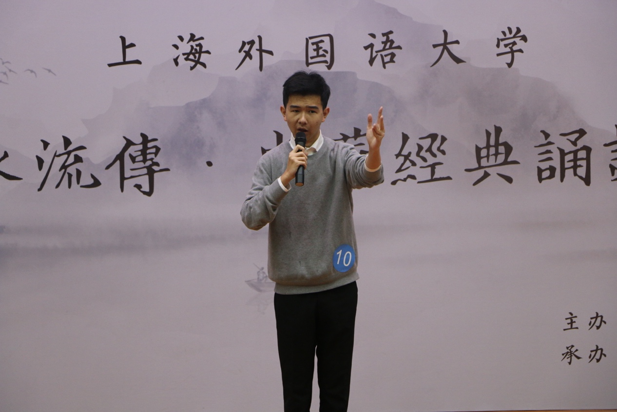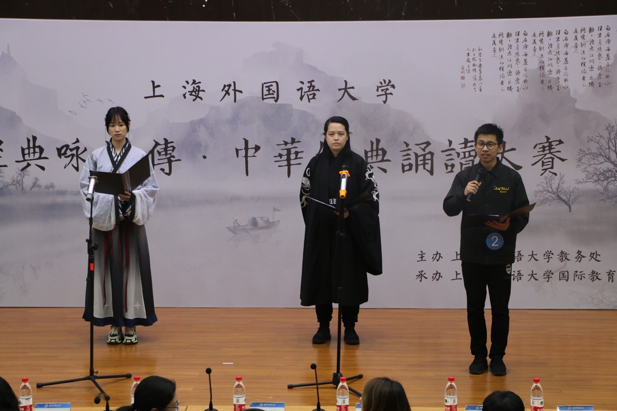 3月28日晚六点,上海外国语大学“经典咏流传”中华经典诵读大赛决赛于图文西厅顺利进行,国际教育学院院长金慧老师、教务处副处长王会花老师、上海视觉艺术学院语委办公室主任,播音主持专业系主任田奇蕊老师、校艺术教育中心常务副主任李然老师、汉语国际教育专业系主任郑瑜老师共同担任本场比赛的评委。来自各个学院的一共16组选手们都精心准备,为我们带来了精彩绝伦的视听盛宴。一字一句,尽是情怀;一颦一蹙,满是深情。无论是唯美清新的深情诉说,还是慷概激昂的壮烈陈词,诗词之美与内心情感的完美融合都在选手们的作品中得到了很好的体现。下面让我们来感受一下此次决赛的精彩瞬间吧!